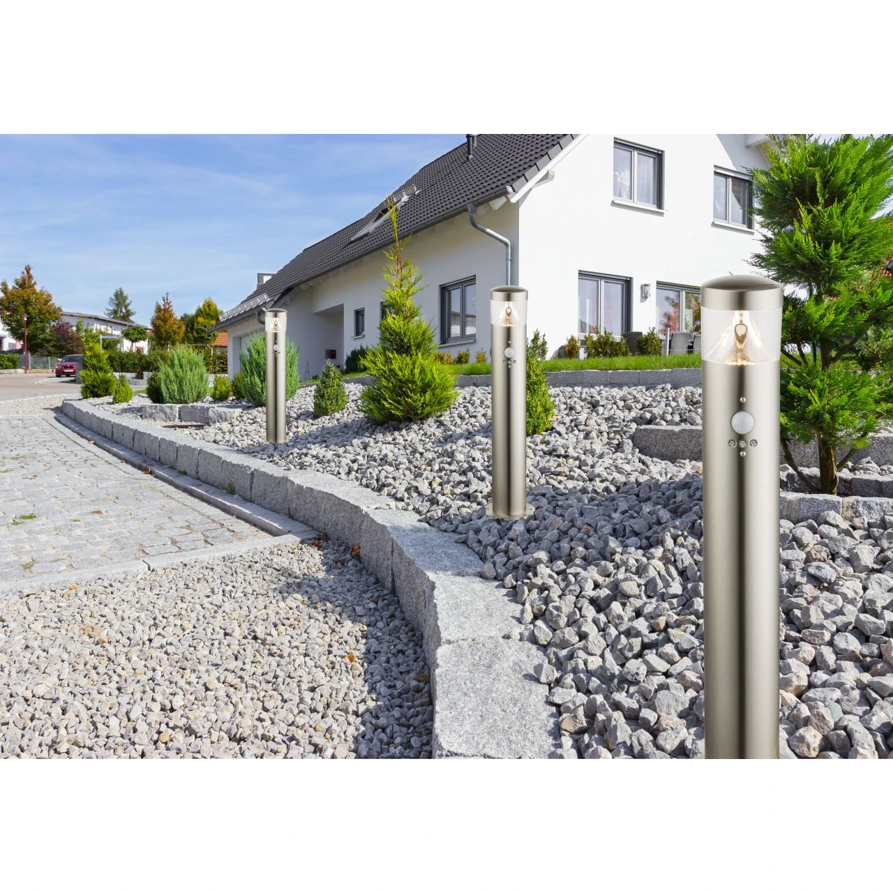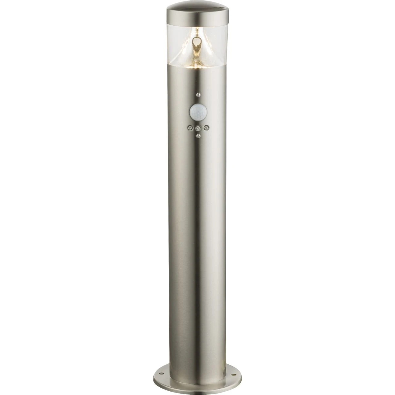 Diese moderne Sockellampe, aus der Fosca-Lampenserie, zeichnet sich durch ihre tolle Verarbeitung aus. Die formschöne Stehlampe ist, aufgrund ihrer Schutzart IP44, gegen Spritzwasser geschützt und für den Außenbereich prädestiniert. Die ein Meter große, moderne Edelstahllampe, weist ein serienmäßiges LED-Leuchtmittel und einen eingebauten Bewegungsmelder (4–8 Meter / 100 °) auf. Des Weiteren verfügt diese Lampe über eine angenehme, warmweiße Lichtfarbe von 3.000 Kelvin.