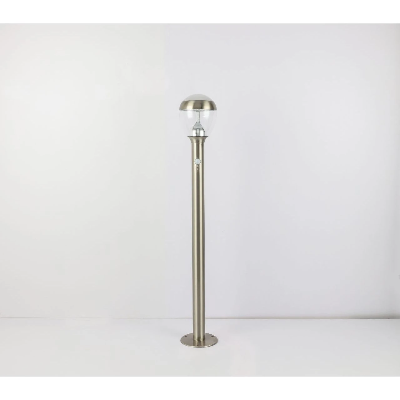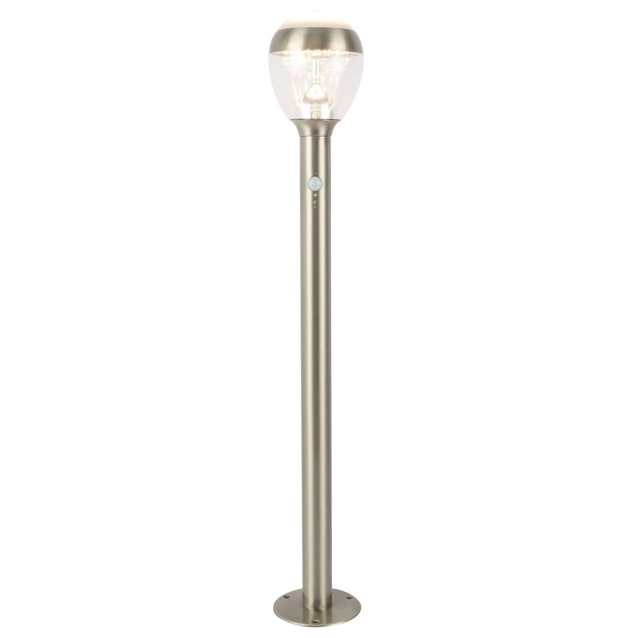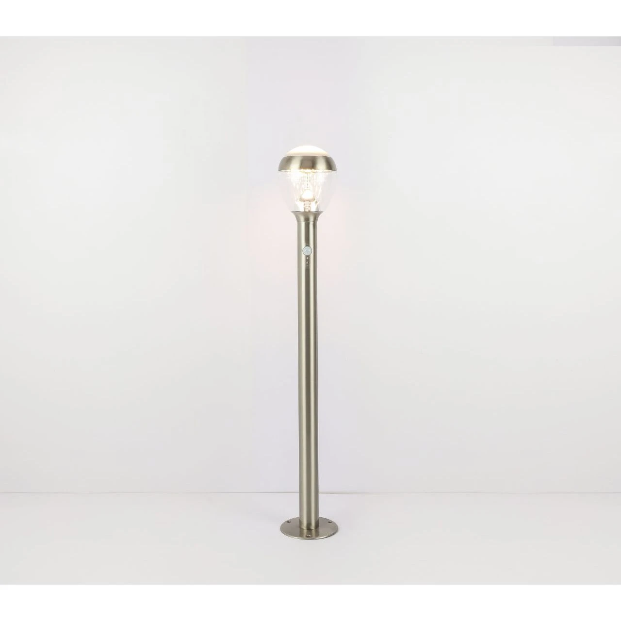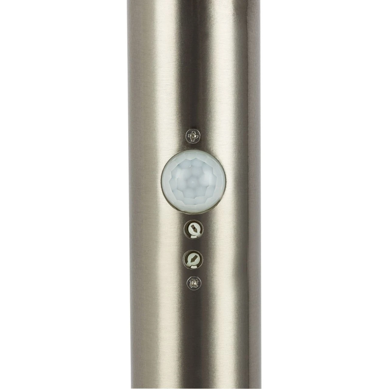 Diese Außenleuchte aus Edelstahl und klaren sowie satiniertem Kunststoff gefertigt, eignet sich besonders gut zur Beleuchtung (750 Lumen) von Wegen und Einfahrten. Das Besondere an dieser Außenlampe ist der eingebaute Bewegungsmelder (2–6 Meter / 90 °). Mit Ihrer IP44 Schutzart eignet sich diese knapp 1 Meter große Sockellampe hervorragend für den Außenbereich.
