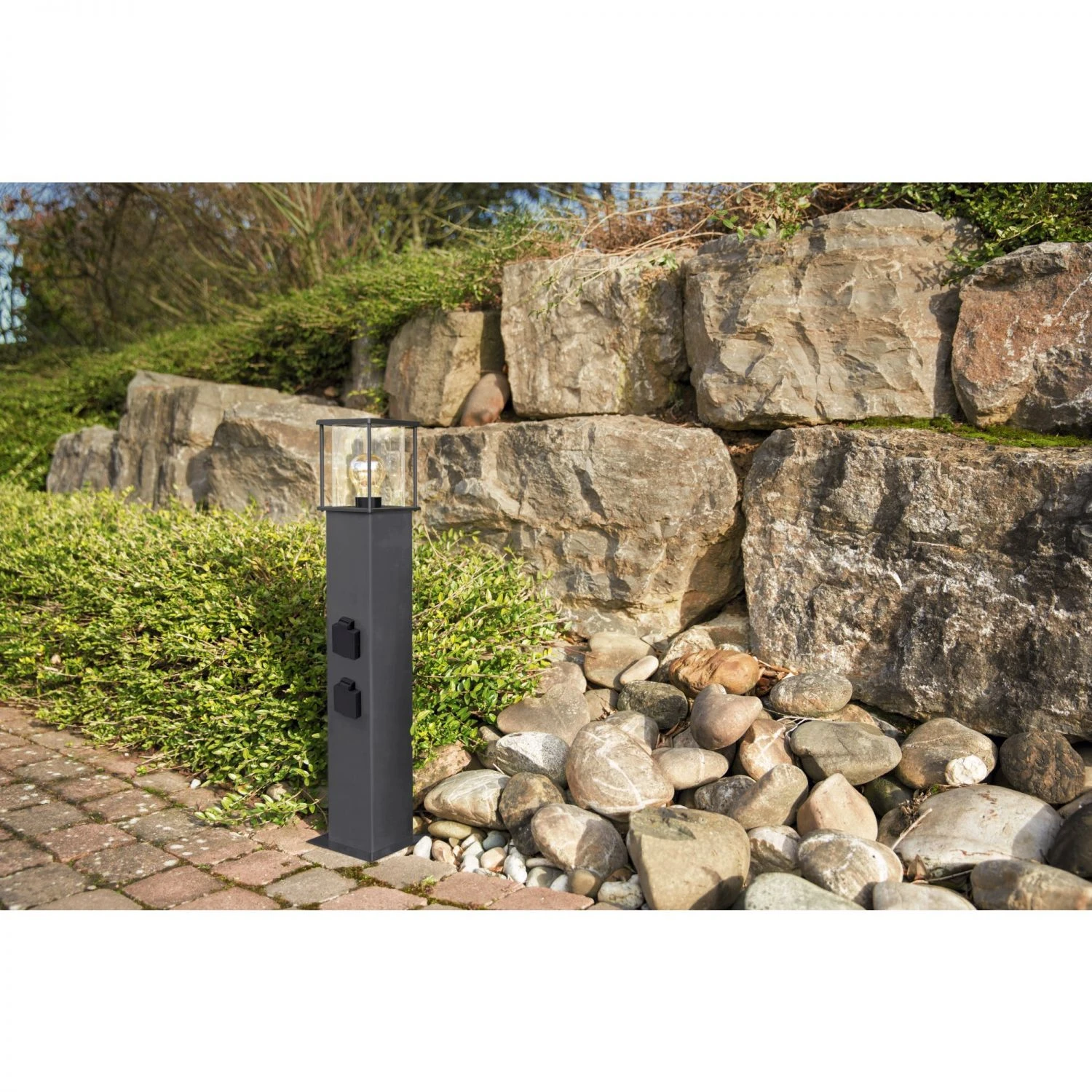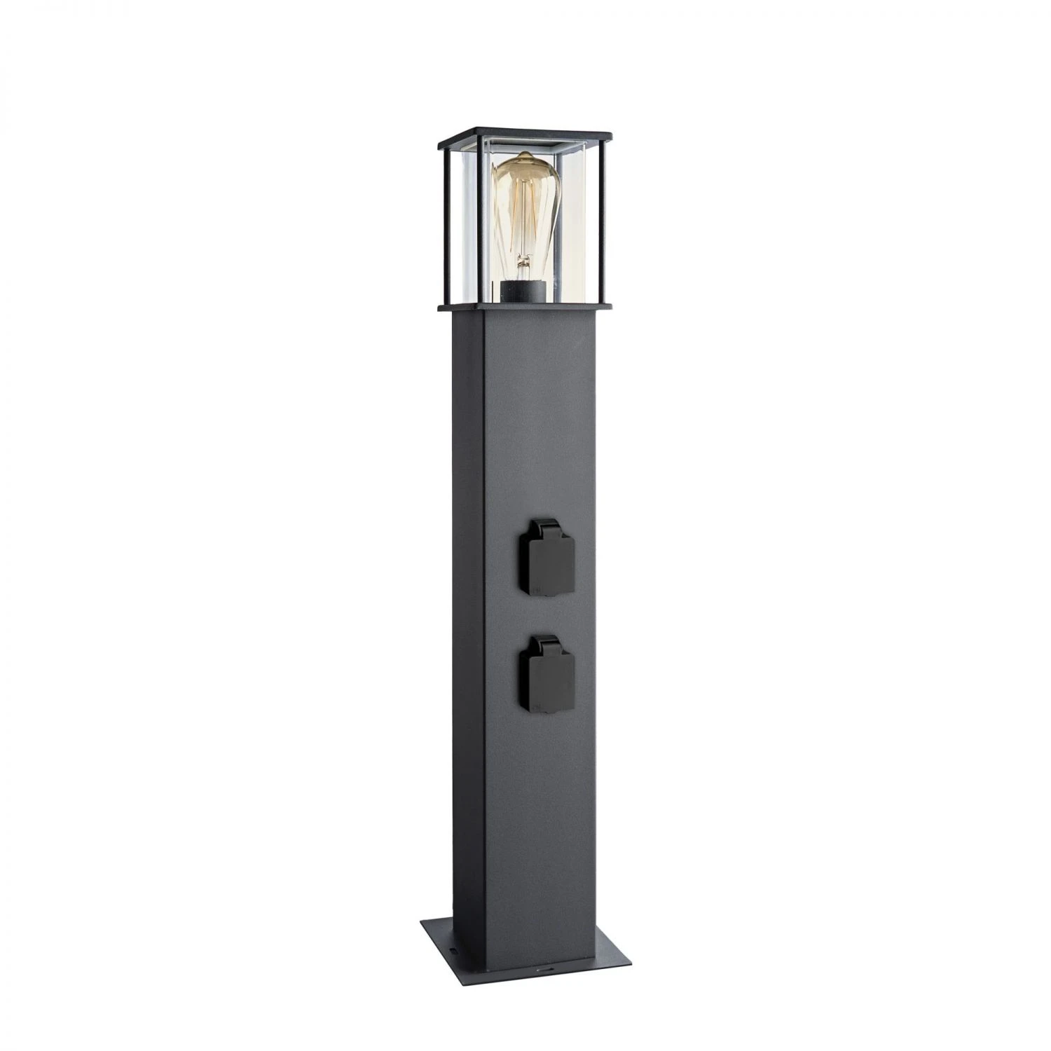 Robuste Sockel- und Standleuchte mit Fassung für Leuchtmittel mit E27-Sockel.Großer und klarer 360°-Lichtaustritt und Korpus aus robustem Edelstahl (V2A). Über die beiden Steckdosen in der Säule können Sie steckerfertige Verbraucher (z.B. Lichterketten) einfach mit Strom versorgen. Bei Verwendung eines 5-adrigen Anschlusskabels können die beiden Steckdosen dauerhaft mit Strom versorgt werden.• E27-Fassung für Leuchtmittel bis 12 W• Korpus aus robustem Edelstahl, anthrazit lackiert (RAL 7016)• Zwei Schutzkontaktsteckdosen, bis 3500 W belastbar• Klarer 360°-Lichtaustritt• Leuchte staub- und spritzwassergeschützt (IP44)• Höhe 70 cm• Inkl. Montagematerial