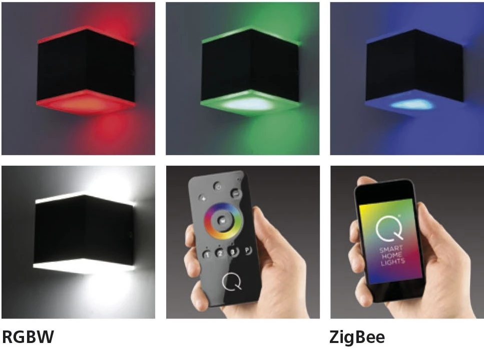 Sie haben die Möglichkeit die Lichtfarbe der Beleuchtung von Warmweiß hin zu bunt, nach Ihrem Geschmack und Bedarf, zu verändern, eine Farbeauswahl aus über 16 Millionen Farbnuancen zu wählen und diese Farbe immer wieder zu wechseln. Dieses erfolgt zum Beispiel über die Q®-Fernbedienung, welche im Lieferumfang enthalten ist, eine weitere Besonderheit ist, dass die Q®-Leuchten in Smart Home Systeme integriert werden können. Diese müssen auf dem ZigBee-Funkstandard basieren.