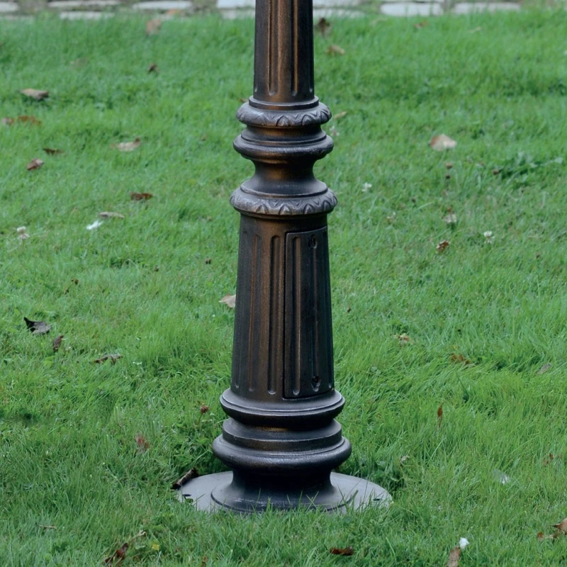 Für den Korpus wurde massives Gusseisen verwendet, geschmiedet und verarbeitet in deutscher Handarbeit. So wurde der Leuchtenkopf mit zierlichen Details in Form von zarten Blattapplikationen verschönert und in einer Eisen-natur Lackier- ung veredelt. Durch die matten Facettenscheiben mit klarem Rand schafft die Sockelleuchte eine gleichmäßige Lichtver- teilung und ist rund ums Haus eine wertvolle Lichtquelle.