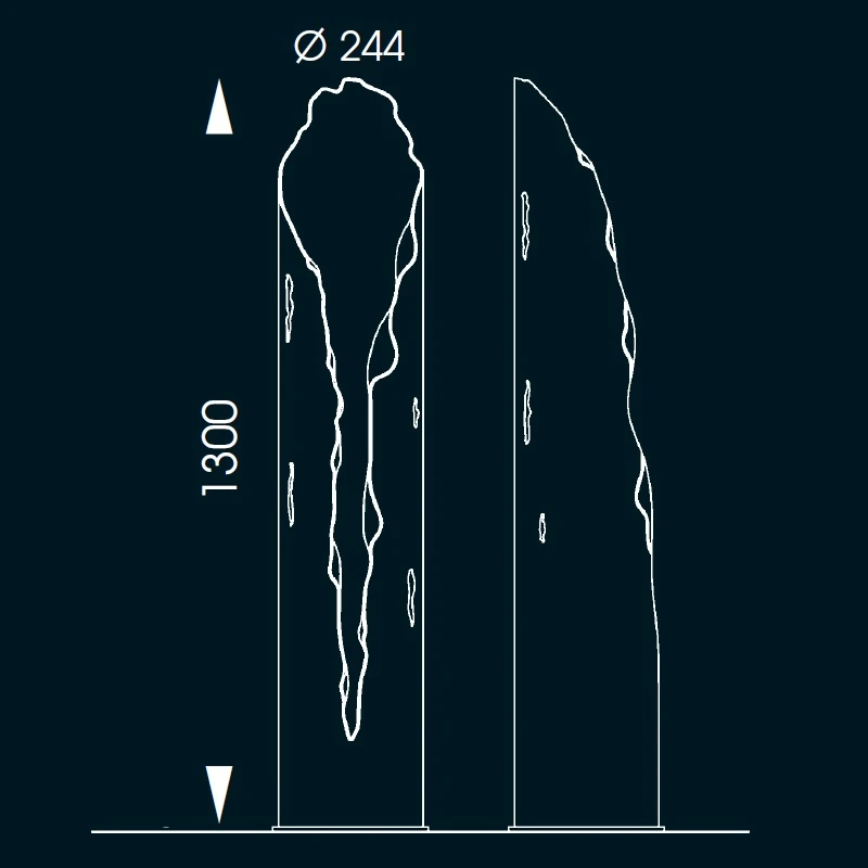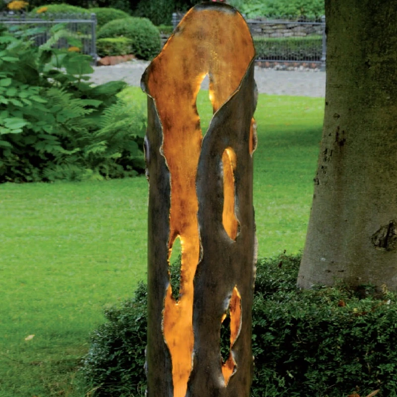 Im Sockel der handgeschmiedeten Leuchte wird das Leuchtmittel platziert, dieses strahlt ein gerichtetes Licht empor und erweckt durch die spannenden Öffnungen und der Lackierung den Effekt eines lodernden Feuers, ohne echte Flammen zu erzeugen.