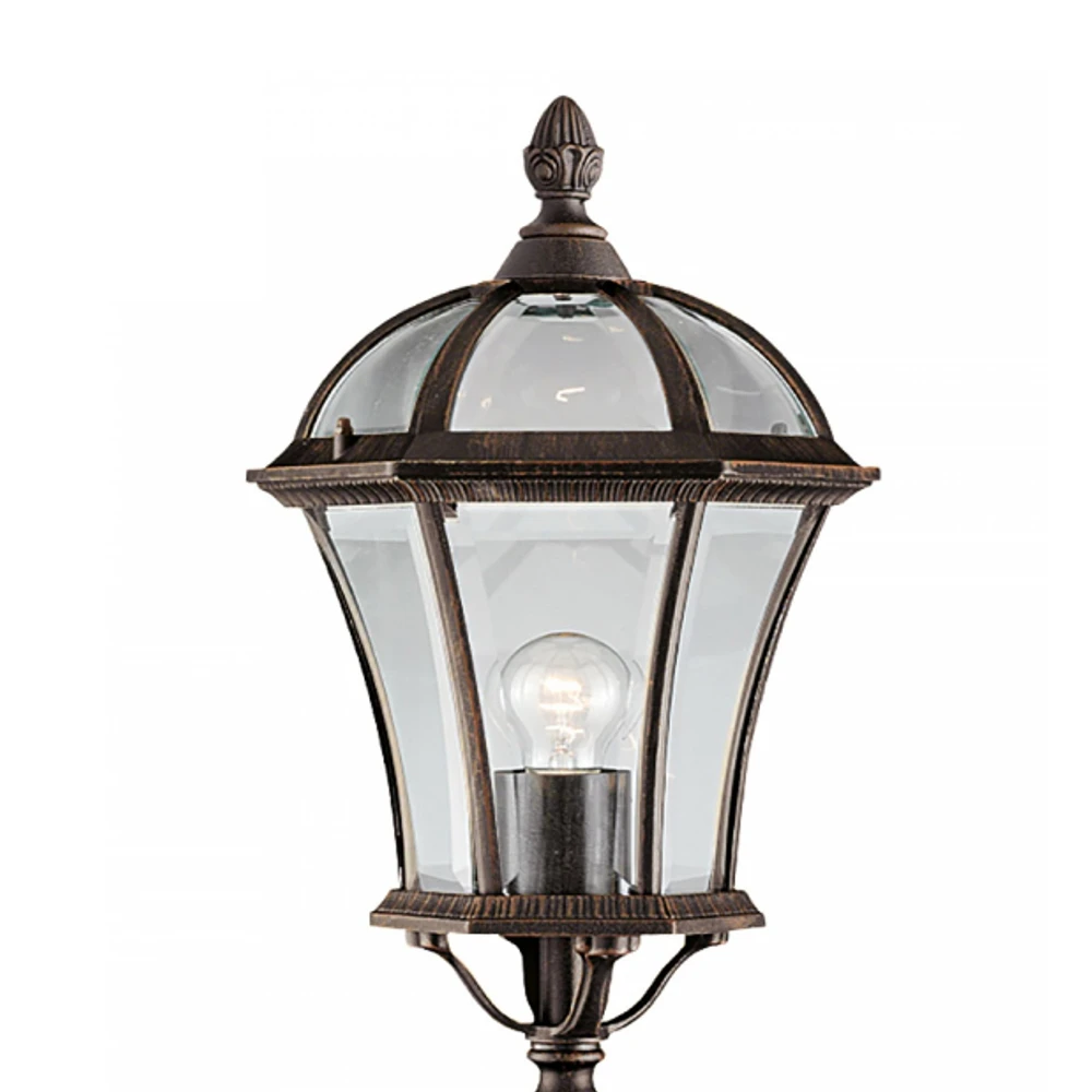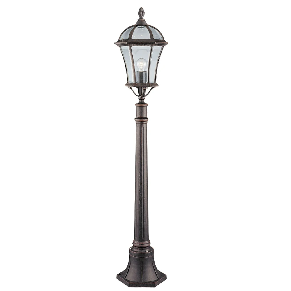 Die traditionell gestaltete Wegeleuchte hat dezente Verzierungen im Metall, ein rustikales braunes Finish verleiht der Leuchte einen schönen Antik-Look. Klarglas mit Kantenschliff schützt das Leuchtmittel vor Feuchtigkeit und vor Witterungsbedingungen.